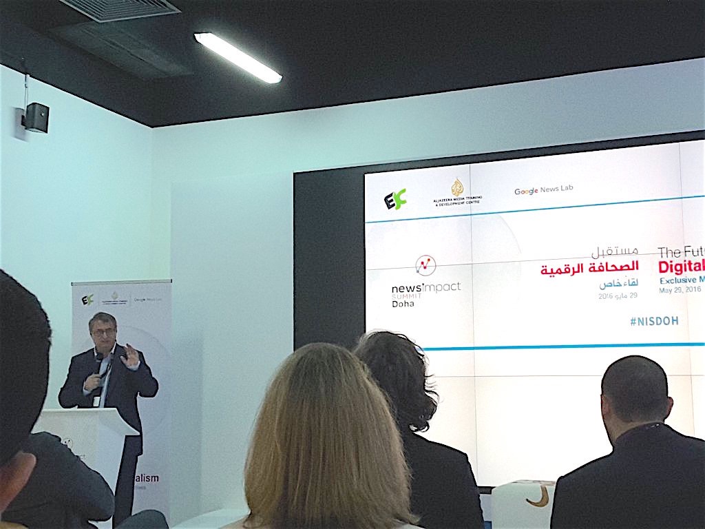 Parlant a Doha, en un acte a la seu d’al Jazeera