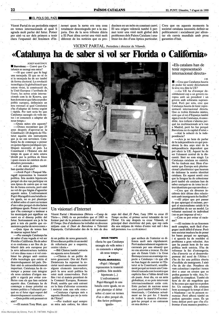 Això em provoca algun problema, és clar. Els caps de premsa dels polítics són francament insistents quan una cosa no els agrada i tinc la sensació a voltes que sóc jo que no els agrade. La meua manera de fer. Així i tot, entenem-nos per tal que quede clar: a mi ningú no m’ha collat mai ni m’han pressionat. Jo aquesta cosa de les pressions no l’he notat mai en la meua vida. Que hi ha gent que s’enfada amb tu, sí. Tanmateix no m’he sentit mai pressionat i no puc dir que mai ningú m’haja pressionat directament perquè diga i deixe de dir res perquè això no ha passat. VilaWeb en aquest sentit és un cas bastant original, certament. Després de vint anys la cosa que em fa més feliç és constatar que hem aconseguit fer un diari ple de llibertat on crec que cap dels periodistes que hi treballen o escriuen tenen mai, tenim mai, la pressió del políticament correcte i encara menys de la censura.